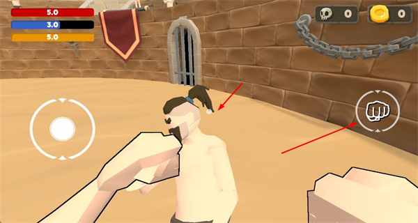 1、进入角斗场景后,通过操作按钮控制角色移动,与对手展开近战对决,消耗对手属性值以推进战局。
