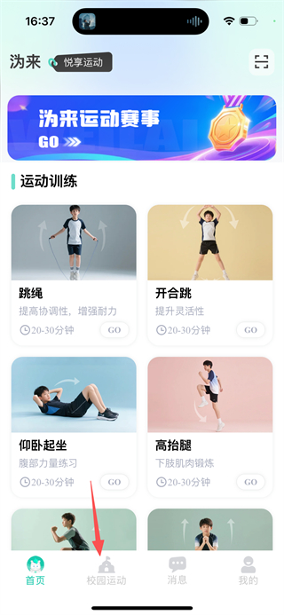 1、在首页点击底部校园运动选项,进入校园运动页面。