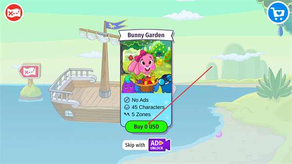 3、在BunnyGarden界面中,可通过Buy0USD解锁内容,也能选SkipwithADunlock,解锁后可体验45Characters等内容。