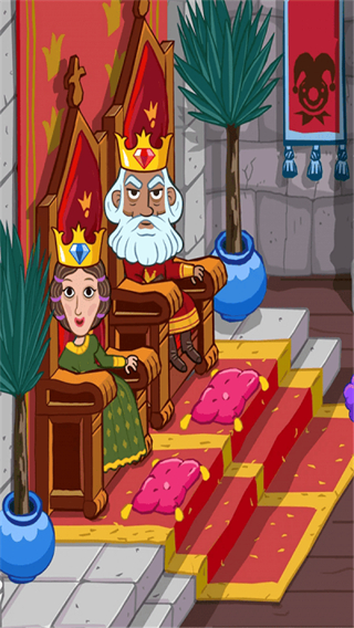 采用色彩明快的卡通画风,角色造型憨态可掬且极具记忆点,场景设计丰富多样,从国王城堡到龙的游乐场,每个区域都充满奇幻氛围。