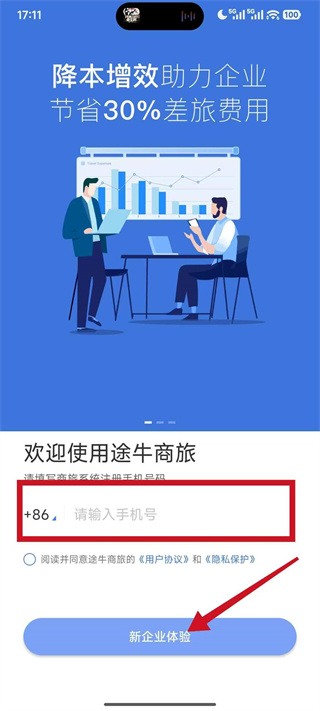 2、在欢迎页面的手机号栏填写对应号码,勾选协议后,点击新企业体验,进入登录方式选择界面。