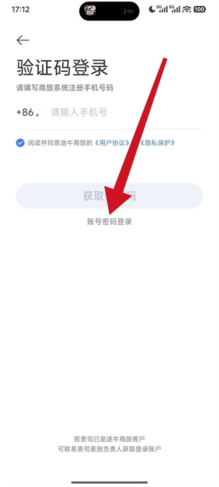 3、在验证码登录页面点击账号密码登录,切换到手机号登录页面。