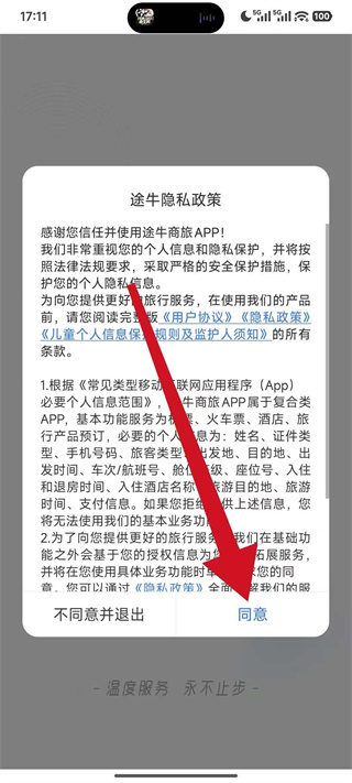 1、打开途牛商旅,在弹出的弹窗中点击同意,进入应用欢迎页面。