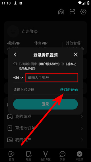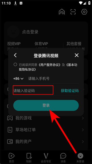 4、将收到的验证码填入验证码框,勾选相关协议后,点击登录完成手机号登录。