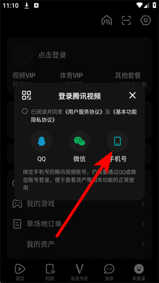 2、在个人中心的登录弹窗里,选择手机号登录方式,进入手机号登录界面。