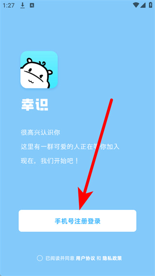 1、打开幸识,在弹窗中点击同意,进入应用的欢迎界面。