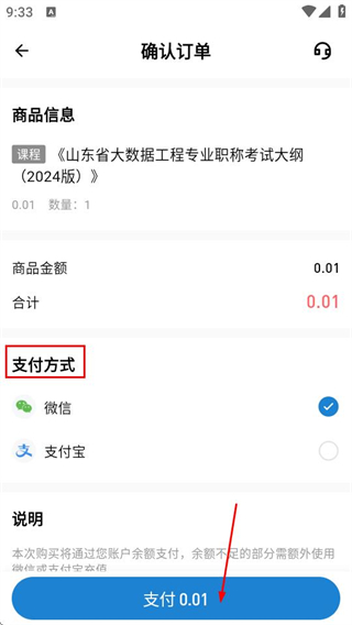 4、在确认订单页面,选择支付方式后点击支付按钮,即可完成课程购买。