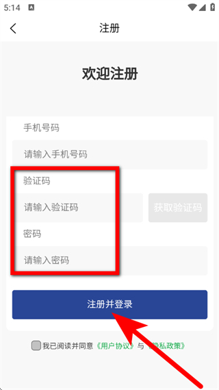 4、输入验证码,再设置密码,勾选后,点击注册并登录,完成账号注册。