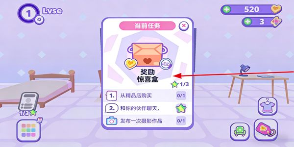 4、打开任务界面查看当前任务,按任务要求完成操作,比如购买物品或发布内容,完成后可获得惊喜盒等奖励。
