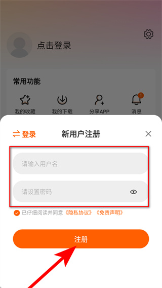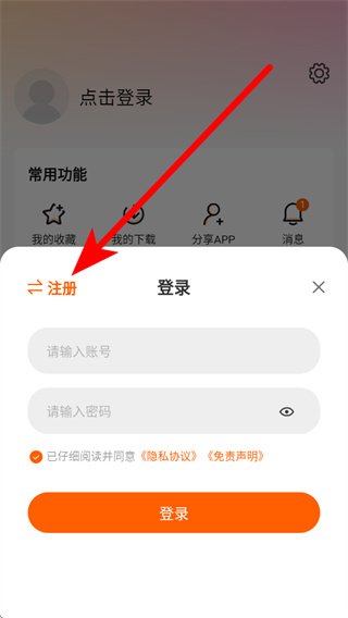 3、在弹窗中点击注册选项,切换到新用户注册界面。