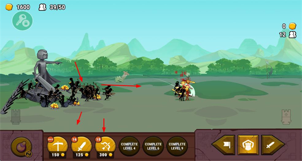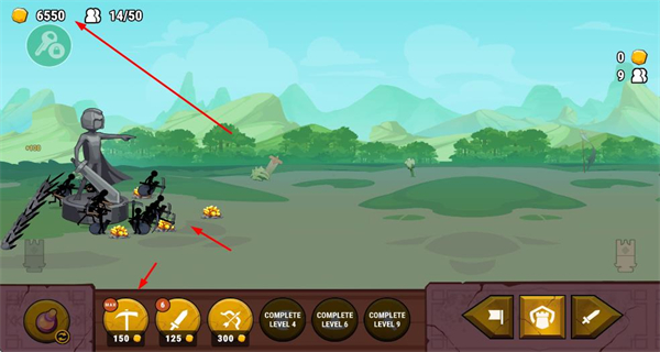 1、在野外场景中收集金币等资源,积累资金以解锁并升级军团单位,为对战铺垫基础。