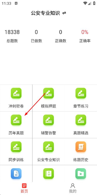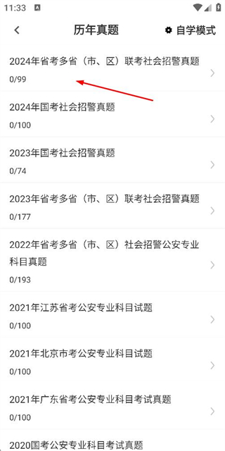 1、在公安专业知识题库首页点击历年真题选项,进入历年真题列表页面。