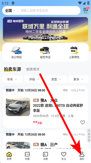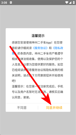 1、打开神州二手车,在弹窗点击同意并继续,进入首页。