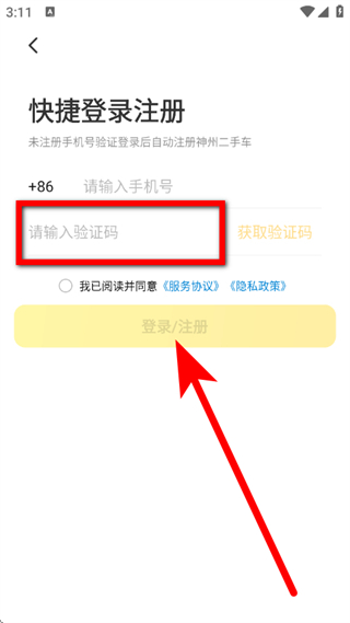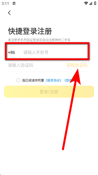 3、在快捷登录注册页面,输入手机号,点击获取验证码。