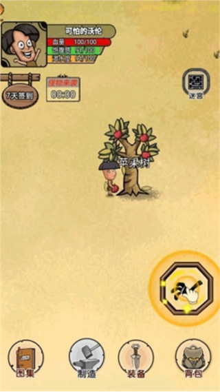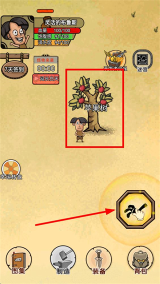 1、进入游戏后,操控角色移动,靠近资源点如苹果树,点击采集按钮获取资源,将资源收入背包。