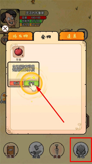 2、打开背包界面,选择收集到的资源如苹果,点击使用按钮,恢复角色的饱腹感与渴水度,维持角色的生存状态。