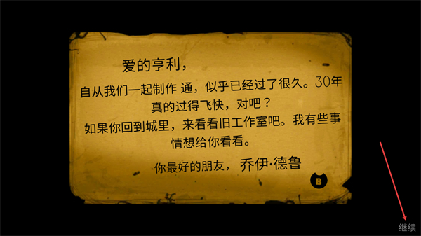2、阅读乔伊·德鲁的信件了解游戏背景故事剧情后,可以点击右下角的继续按钮推进游戏剧情。