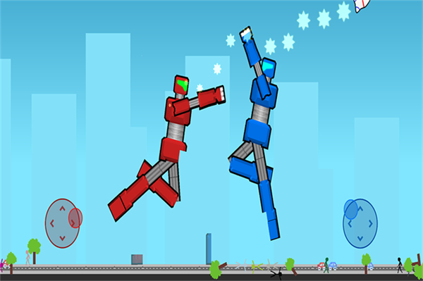机甲棒斗士是一款主打本地多人混战的热血机甲格斗作品,以火柴人驾驶巨型机甲为核心设定,在全可破坏的动态战场中,为玩家带来紧张刺激的同屏对抗体验,支持2-4人实时联机,无论是触屏滑动还是外接手柄都能精准操控,轻松上手即可开启机甲互搏,你可以活用场景机关与海量道具,上演抛飞、轰击等酷炫操作,更能自由定制机甲外观与武器组合。