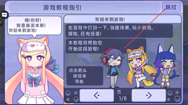1、打开游戏后进入教程指引页面,派泰斯本会欢迎你来到游戏,本教程将帮你开启这段旅程,点击箭头按钮即可进行导航。