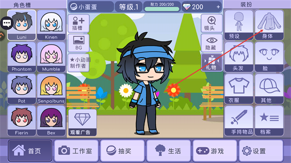 2、这是角色相关页面,你可在左侧选择角色,也能通过拍摄、BG等功能进行设置,右侧有预设、身体、头发等装扮选项。