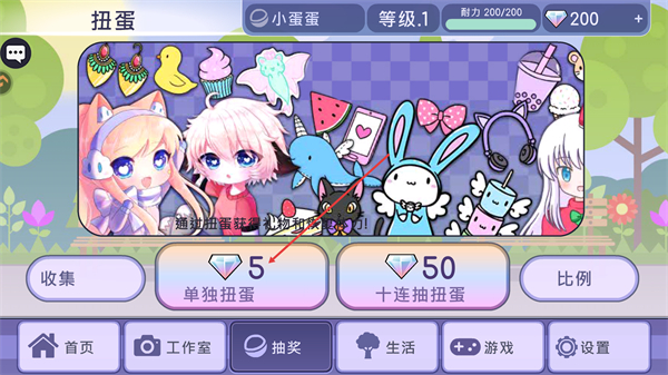 4、进入扭蛋页面,你可消耗钻石进行扭蛋,单独扭蛋需消耗5颗钻石,十连抽扭蛋需消耗50颗钻石,通过扭蛋可收集到各种物品来丰富你的游戏体验。