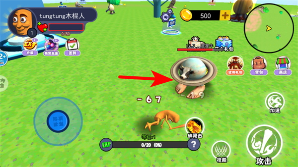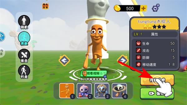 1、进入游戏后,点击红色箭头指向的升级按钮,提升角色的属性,增强角色的战斗与生存能力,这是养成角色的关键操作。