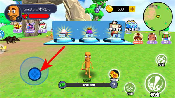 2、游戏中依照红色箭头指引,操作左侧移动按钮控制角色移动,朝着场景内的目标区域前进,探索场景中的资源与互动点。