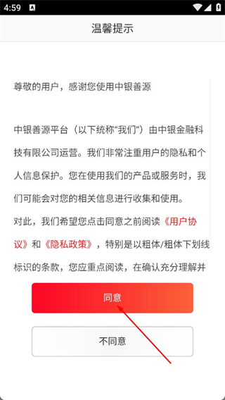 1、在温馨提示弹窗中,阅读用户协议和隐私政策后,点击同意。