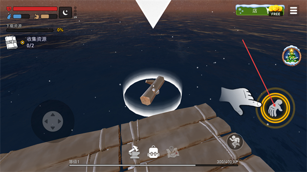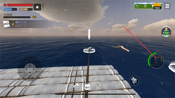 2、进入生存模式后,界面显示收集资源任务,点击右侧的手型按钮,可收集海上的资源,以此推进该任务的进度。