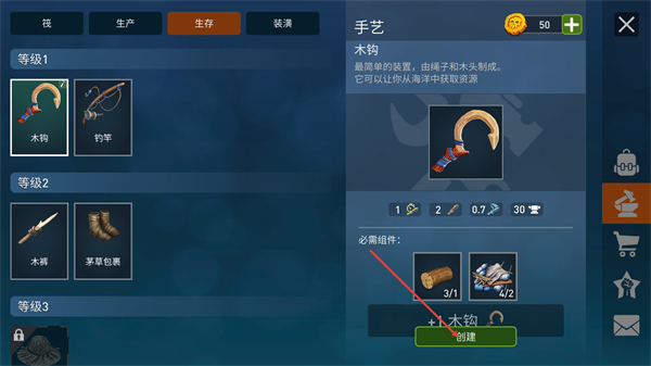 3、在生存分类的手艺界面中,选择木钩它能从海洋获取资源,确认所需组件满足后,点击创建按钮即可制作该装置。