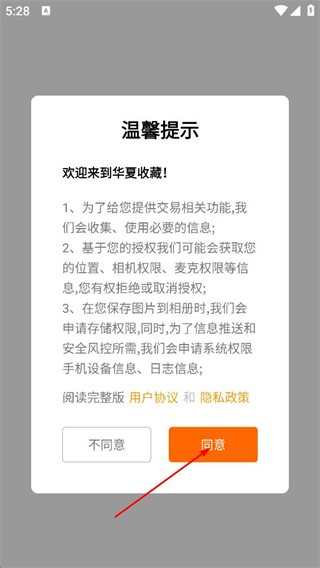 1、在温馨提示弹窗中,阅读隐私政策后,点击同意按钮。