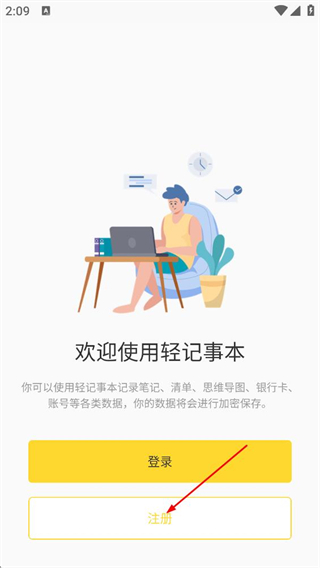 1、在轻记事本欢迎页,点击注册的按钮,进入注册页面。