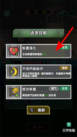 2、在选择技能界面,点击恢复强化技能生命恢复效果增加30%,可习得该生存类技能,提升后续生命能力。