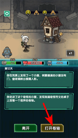 4、在荒原小屋中,点击打开卷轴按钮,可获取卷轴对应的道具或线索,推进游戏剧情与资源收集进度。
