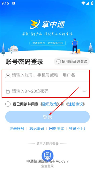 2、在掌中通登录页,点击使用密码登录选项,切换至账号密码登录方式。