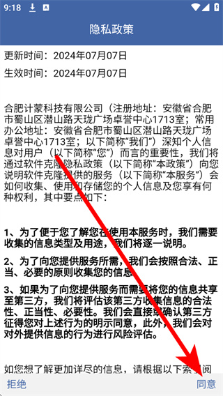 1、打开软件克隆,在弹窗中点击同意,进入首页。