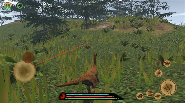 1、操控小型恐龙在丛林移动,观察周围环境,躲避大型生物,保障自身安全。