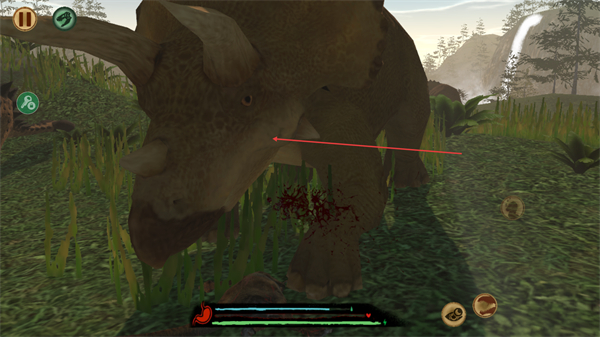 3、遭遇三角龙,被攻击后损失血量,需及时规避危险,减少伤害。
