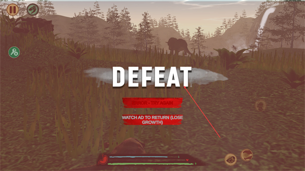 4、战斗失败后显示DEFEAT,可选择TRYAGAIN重新挑战,继续生存探索。