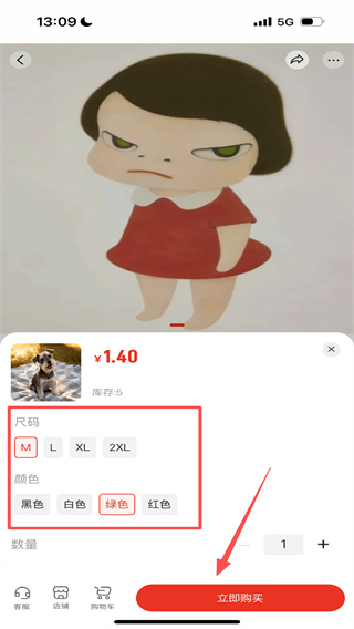 3、在艺品详情页面,点击立即购买按钮,会打开规格选择弹窗。
