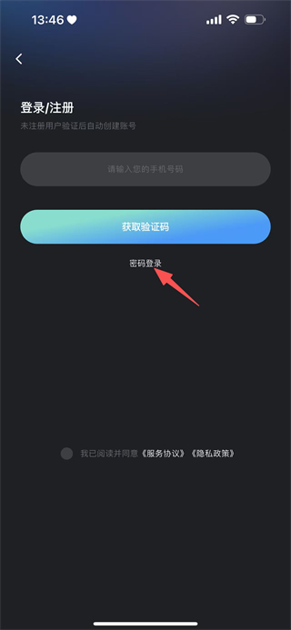 2、在登录/注册页面,点击密码登录选项,切换到密码登录界面。
