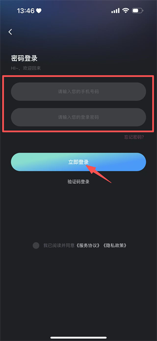 4、在密码登录界面,填写手机号码和登录密码,点击立即登录,完成登录。