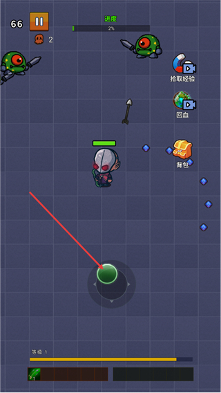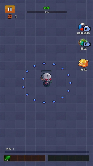 1、在该游戏场景中,操控角色靠近并收集蓝色晶体道具,同时躲避敌方单位的攻击,可借助右侧回血等功能按钮辅助战斗,推进游戏进度。
