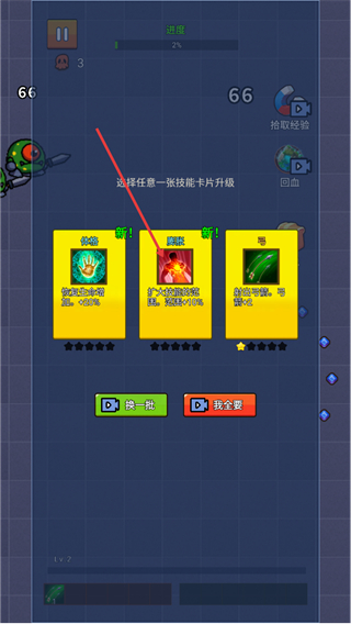 2、当触发技能升级界面时,根据提示选择任意一张技能卡片升级,挑选其中一张技能卡完成升级,也可通过换一批按钮更换卡片,以此提升角色能力。