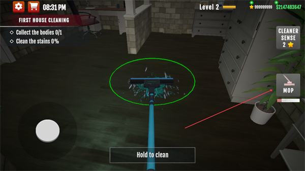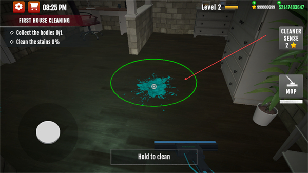 2、找到地面污渍,切换拖把工具,长按Holdtoclean开始清理污渍。