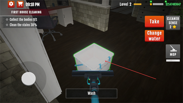 4、当拖把需要清洁时,找到水桶,点击Wash清洗拖把,以便继续清洁。