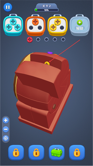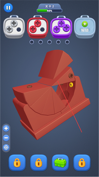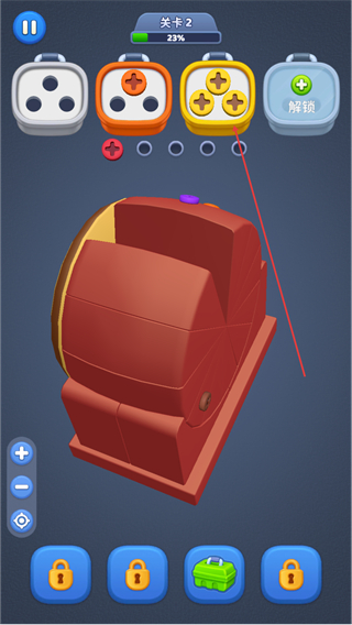 1、在关卡2中,观察红色装置上的螺丝如黄色螺丝,匹配上方对应图案的工具包黄色十字图。