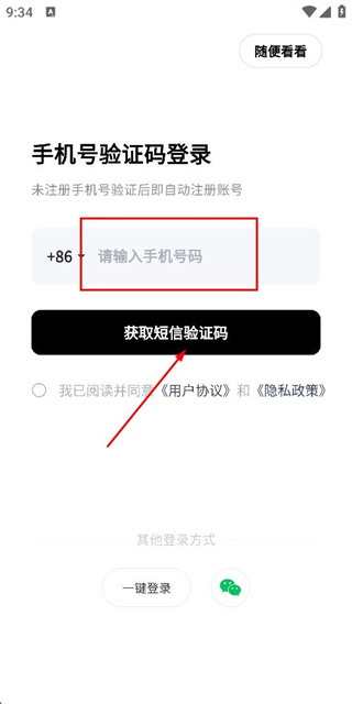 2、在登录页面填写手机号,勾选协议后,点击获取短信验证码。