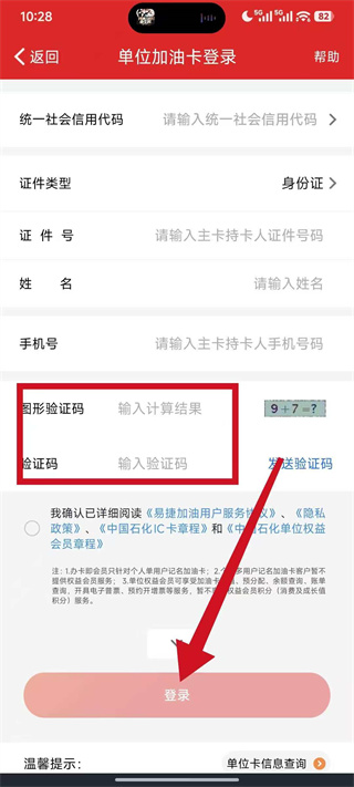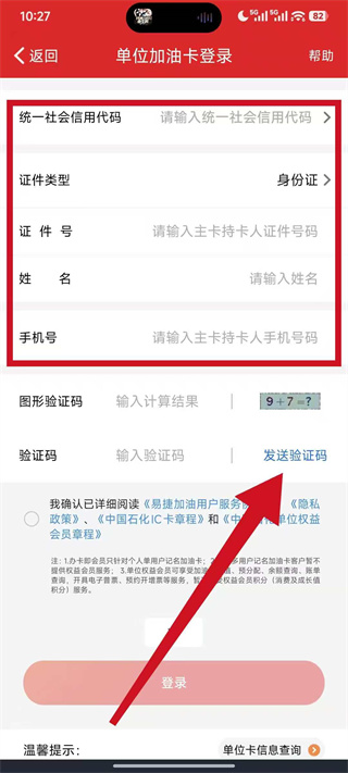 3、在单位加油卡登录页填写单位信息信息,点击发送验证码。