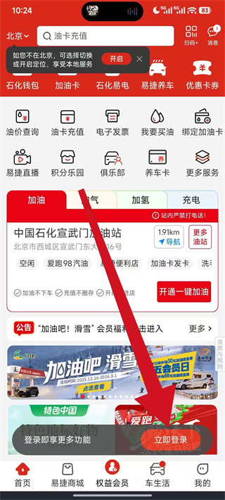 1、打开易捷加油,在首页点击立即登录,进入登录选择界面。